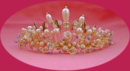 Anne-Marie Tiara is made of Diamante Rondelles and Ivory Pearls, Daffodils and Lilies interwoven with Sapphire, Bermuda and Aqua Blue Crystals. Height 4.5cm.
